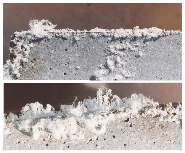 2.如上所述,鋁酸鈣水泥水化產(chǎn)物與大氣中的CO2、SO2、H2S等氣體反應(yīng)生成的鹽類在耐火澆注料表面聚集,當(dāng)濃度超過這些鹽類化合物的溶解度時(shí),也在耐火澆注料表面產(chǎn)生結(jié)晶。
